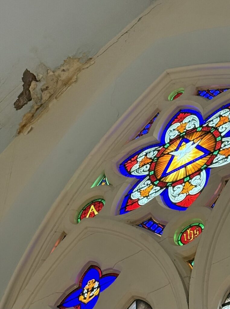 St. Mark’s Episcopal Church, LeRoy was awarded two grants this summer that helped address a long-standing roof issue that caused disintegrating plaster and discolored paint above the altar inside the church. A further concern was the possible damage to the very large and notable “Resurrection Window,” designed by the Rev. Bishop John Barrett Kerfoot (1816-1881), first Bishop of Pittsburgh on the wall below this area.