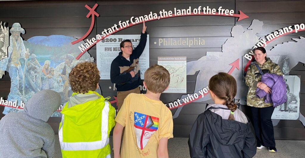 For many of the youth, this visit was eye-opening. They learned how Niagara Falls was more than just a natural wonder—it was a vital crossing point on the Underground Railroad, a symbol of hope for those escaping bondage in search of a new life across the border. The youth group from St. Luke’s Episcopal Church in Jamestown continued on to Niagara Falls State Park — where they were able to see for themselves the precise crossing point just above the falls, where people were ferried (or, in some cases, swam!) to safety in Canada. Participants reflected on the grit, determination, and resolve required by such a journey.